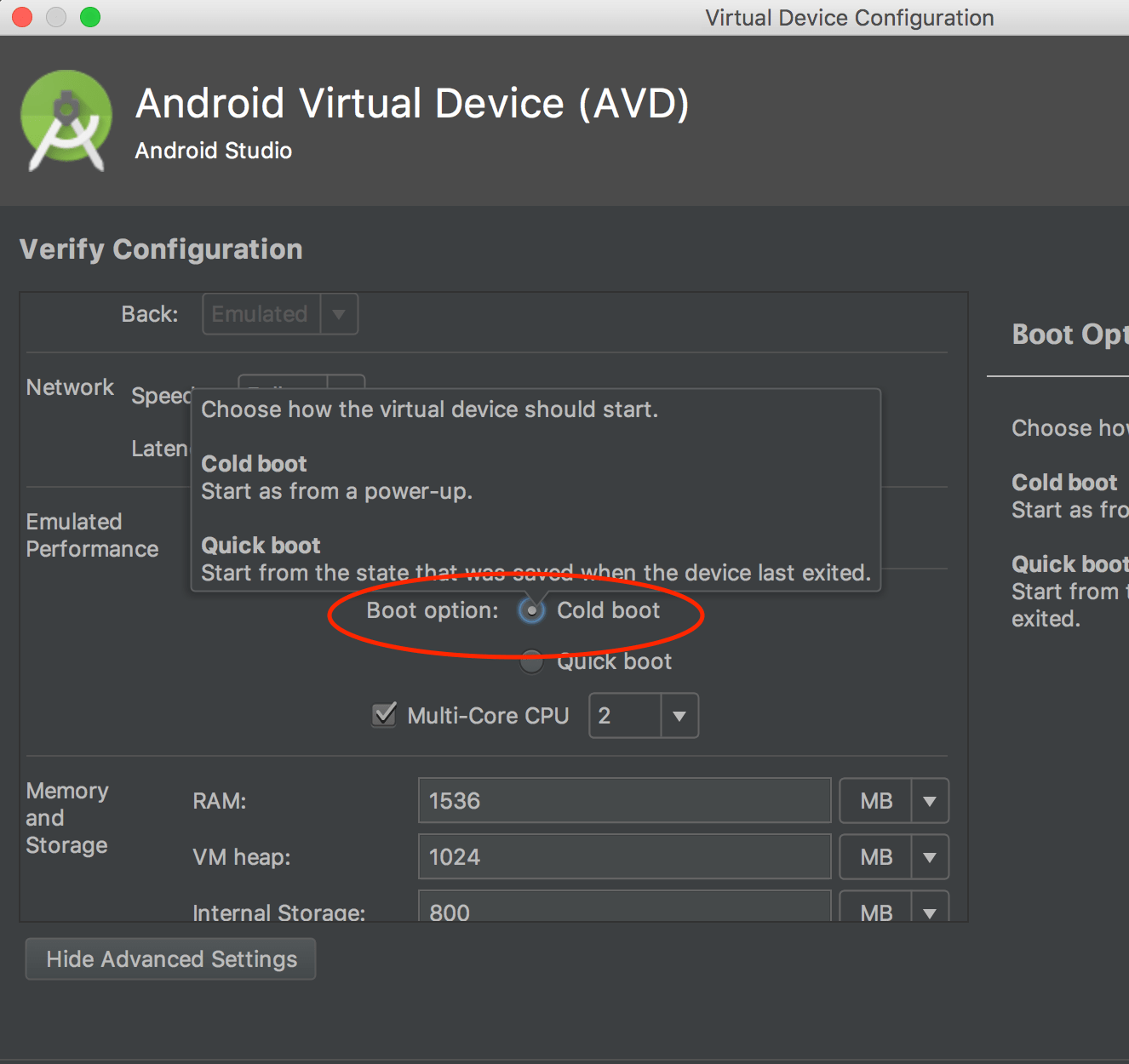 最新的Android Studio版本不再具有此选项。如果问题仍然存在,请尝试在验证配置对话框(如果可用)中的"仿真性能"下拉列表的值之间切换,或参考配置仿真器图形渲染和硬件加速。
