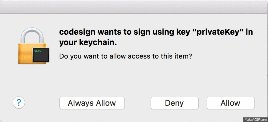 我已经连接了企业证书和内部配置文件。 我已经安装了证书,并且Xcode 7.1提示我此权限请求警报。 我单击始终允许。 我单击允许。