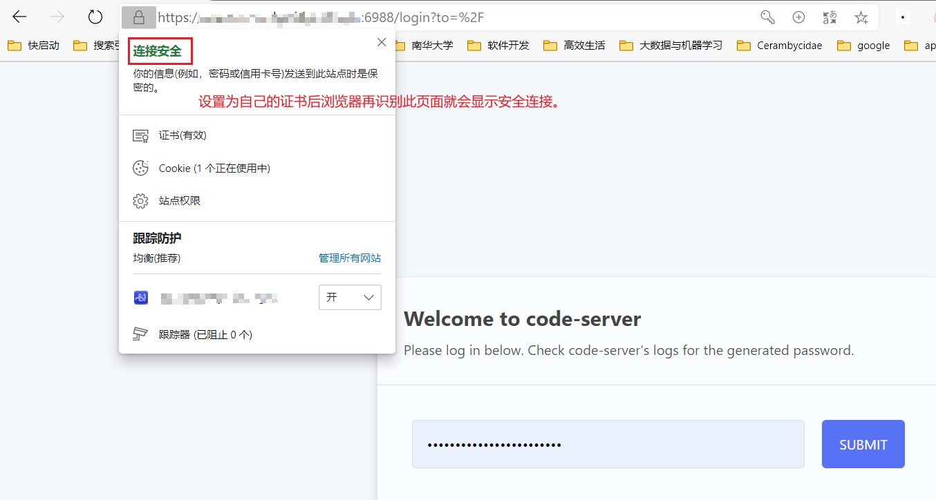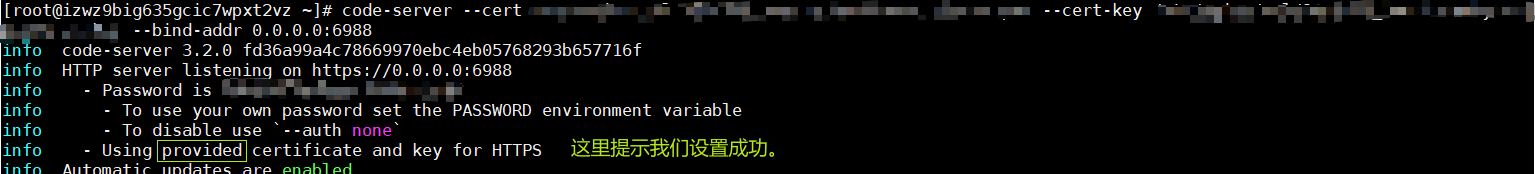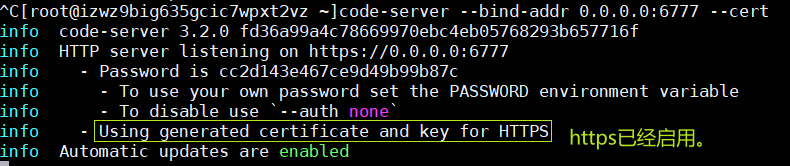 1 | code-server --bind-addr 0.0.0.0:[你的端口号] --cert |