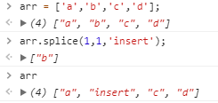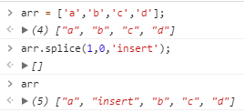 用法:array.splice(index,0,insertValue),返回值为空数组,array值为最终结果值。